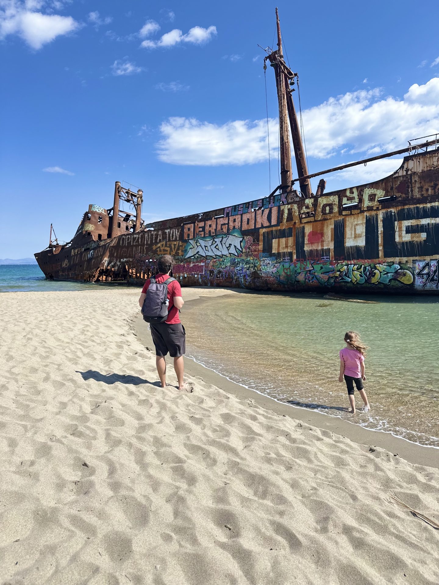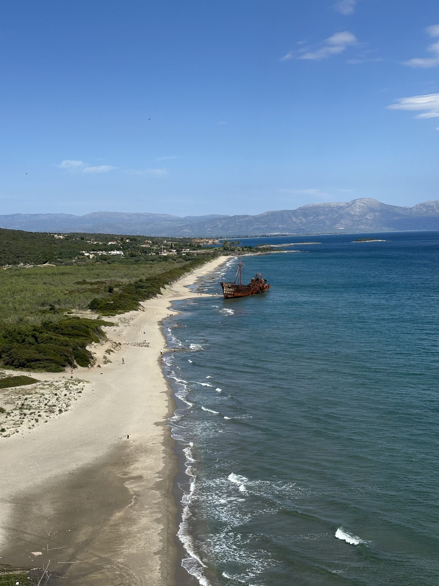 Le nekaj kilometrov severno od Gythia se na plaži Valtaki nahaja ena najbolj ikoničnih znamenitosti v regiji – razbitina ladje Dimitrios, ki že desetletja miruje v plitvini in ustvarja osupljiv kontrast z modrim morjem in zlatim peskom.