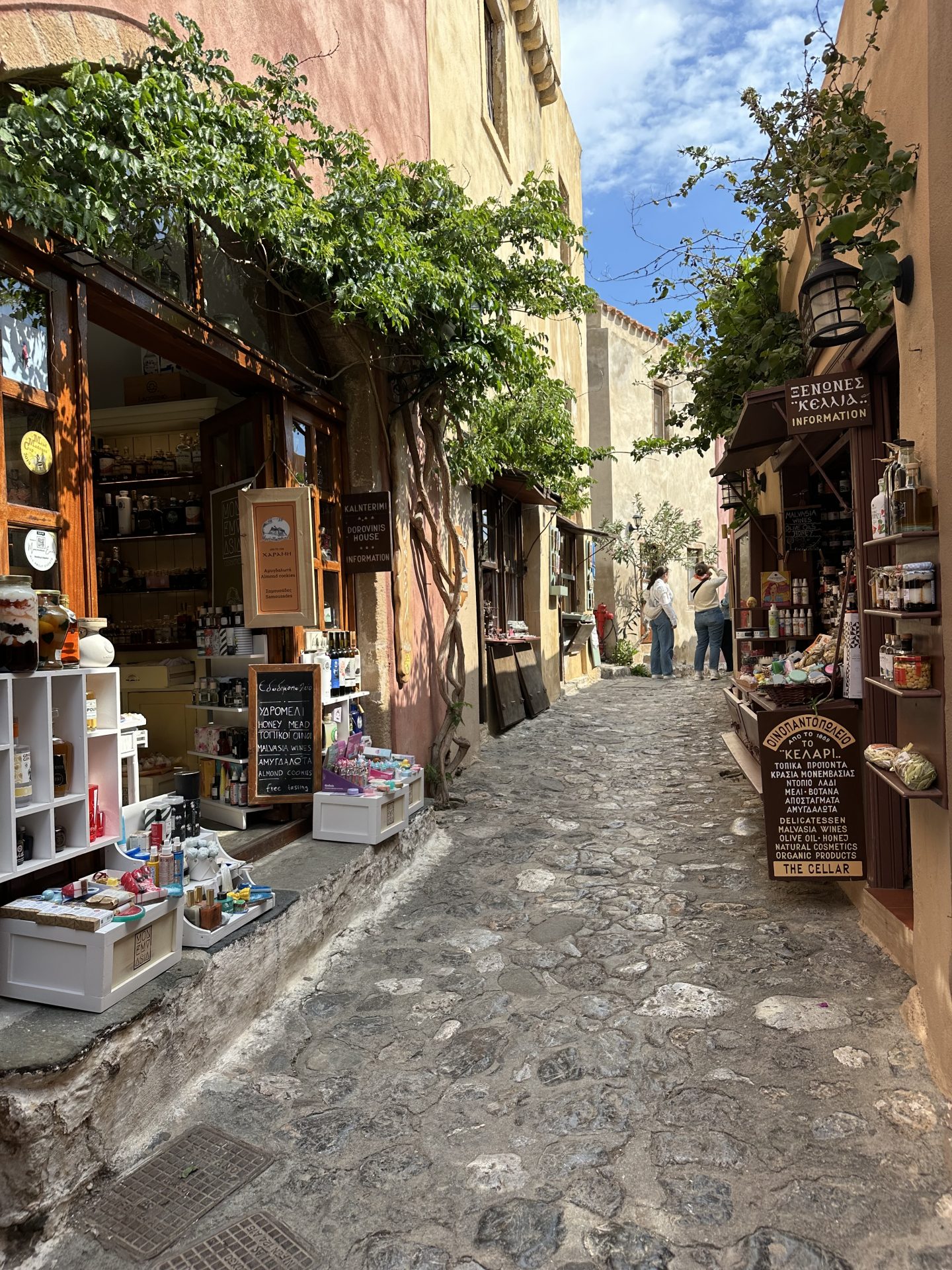 Spodnje mesto je srce Monemvasie, kjer najdete restavracije, kavarne, galerije in butične nastanitve, ki so ohranile izvirno arhitekturo. Hiše iz medeno obarvanega kamna, lesena polkna in bogato cvetje ustvarjajo nepozabno kuliso.