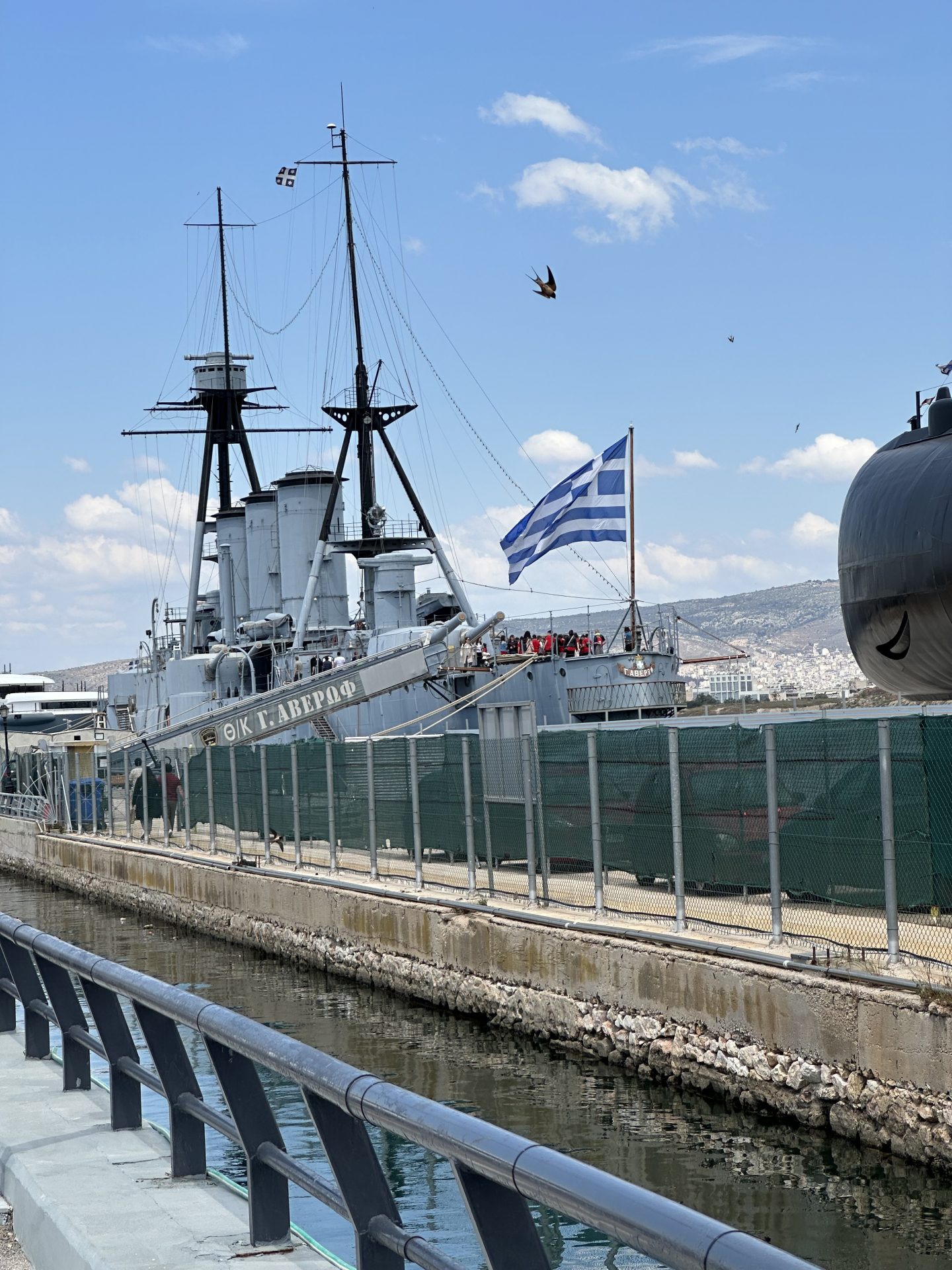 Potep po Atenah smo zaključili z obiskom obalnega predela in vojaške ladje Georgios Averof, zasidrane v marini Flisvos. Gre za impozantno oklepno križarko iz začetka 20. stoletja, ki danes deluje kot pomorski muzej. Ladja je odlično ohranjena, njen ogled (3 € za odrasle) pa je zanimiv in poučen za vse generacije.